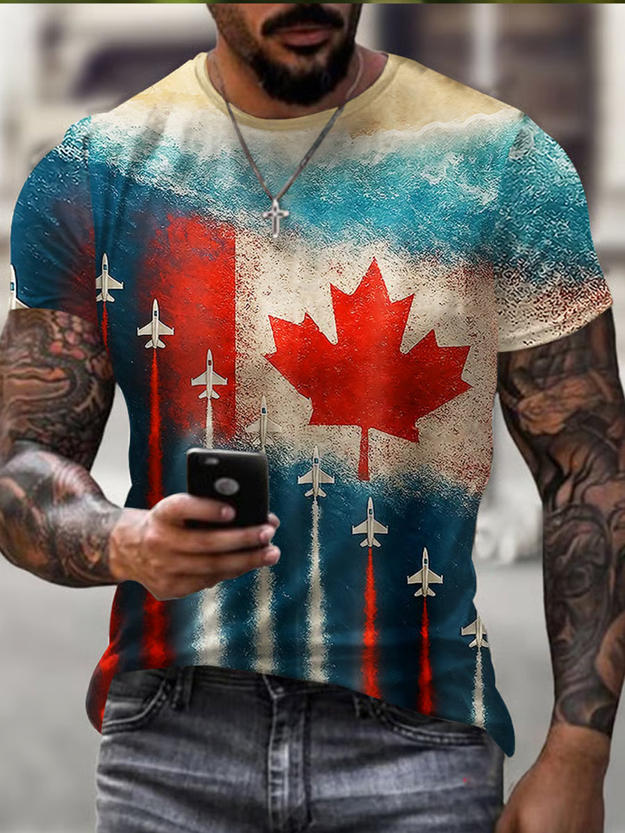 Men's Canadian Air Plane And Maple Leaf Print Casual Tee