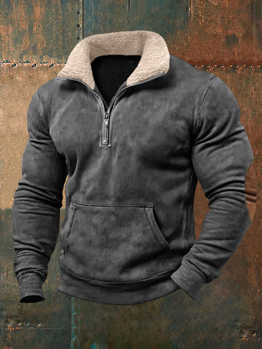 Men's Retro Pure Color Fur Collar Casual Zipper Sweatshirt
