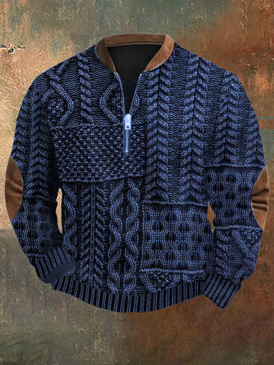 Men's Vintage Cable Pattern Print Casual Zipper Sweatshirt