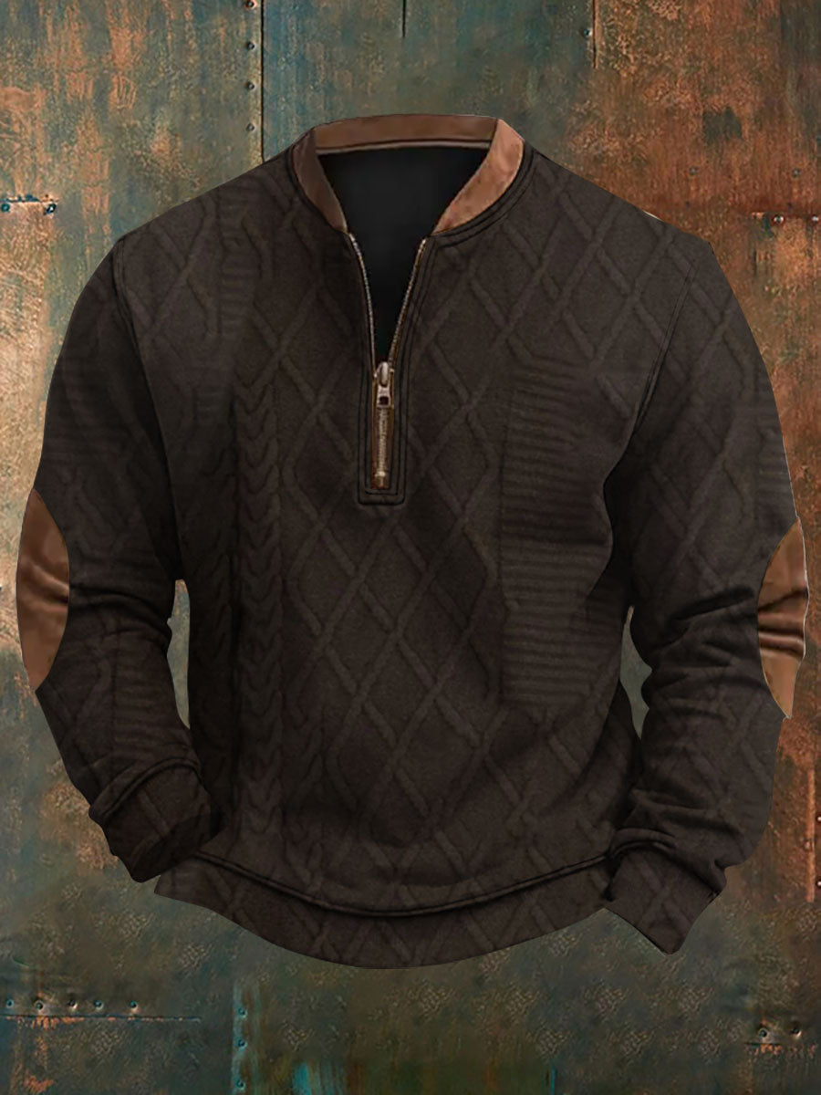 Men's Vintage Herringbone Print Casual Zipper Sweatshirt