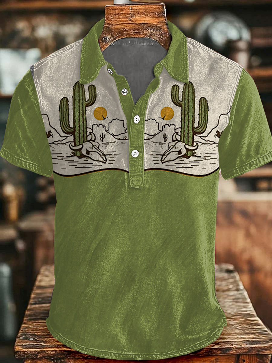Men's Vintage Western Desert Cactus Bull Skull Print Casual Buttons Top