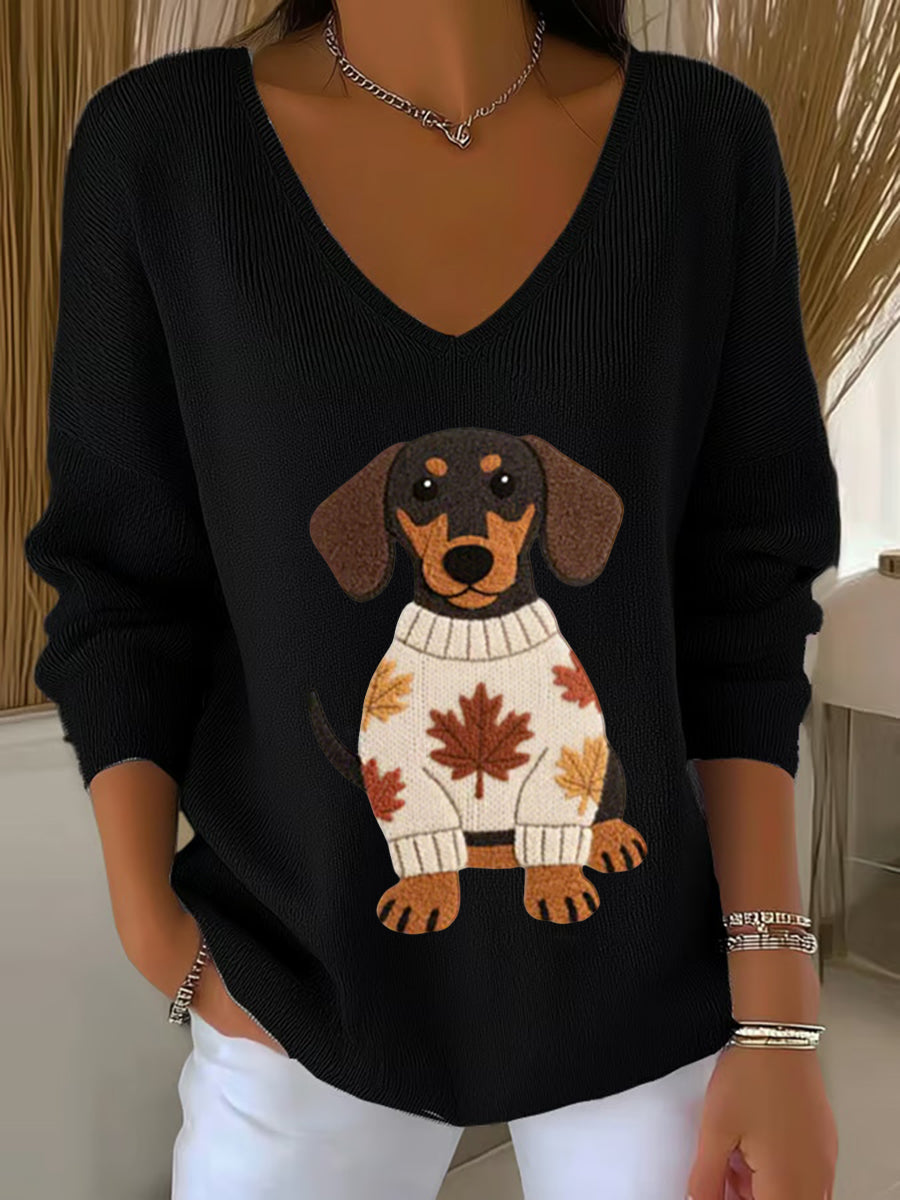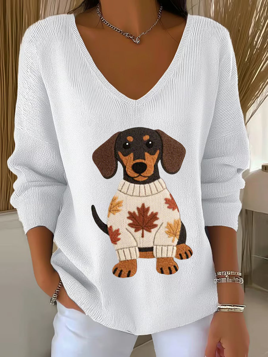 Women's Autumn Dog Art Print V-Neck Ribbed Top