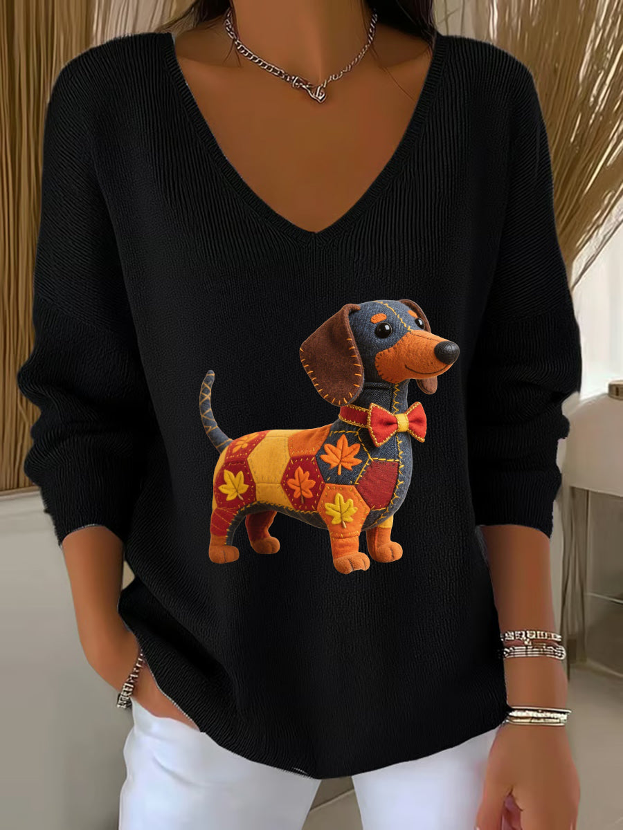 Women's Autumn Dog Art Print V-Neck Ribbed Top