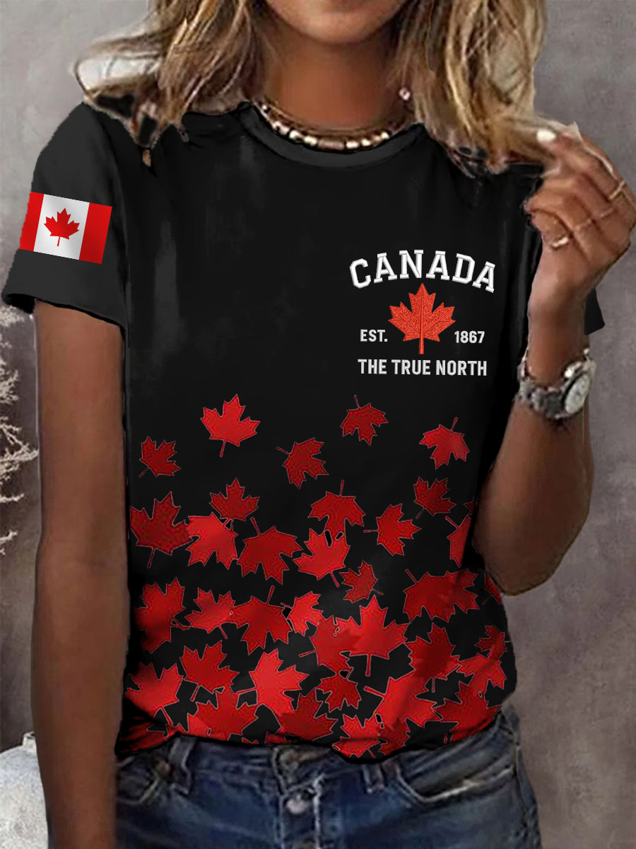 Women's Canada Est 1867 The True North Strong And Free Canadian Maple Leaf Print Casual Tee