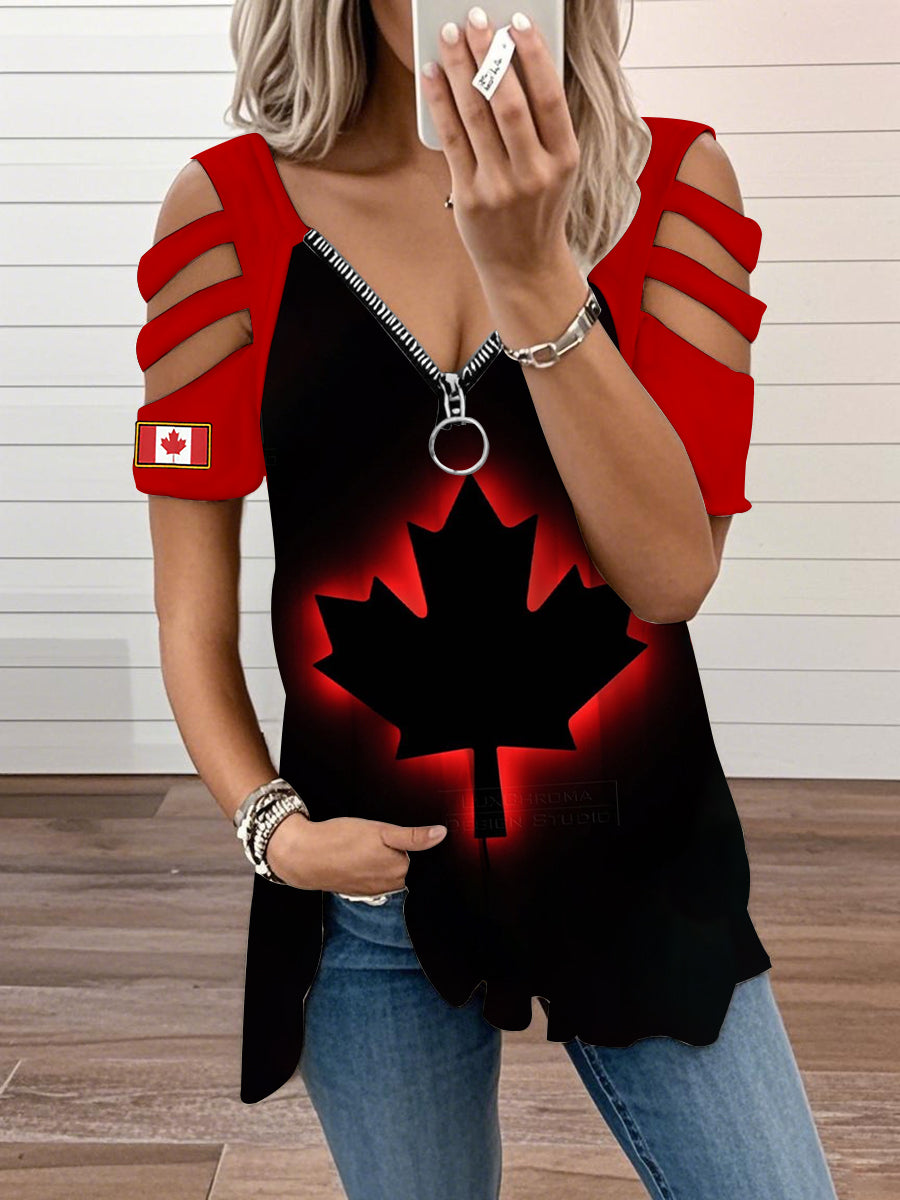 Women's Canada Flag Maple Leaf Short Sleeve V-neck Zipper T-shirt