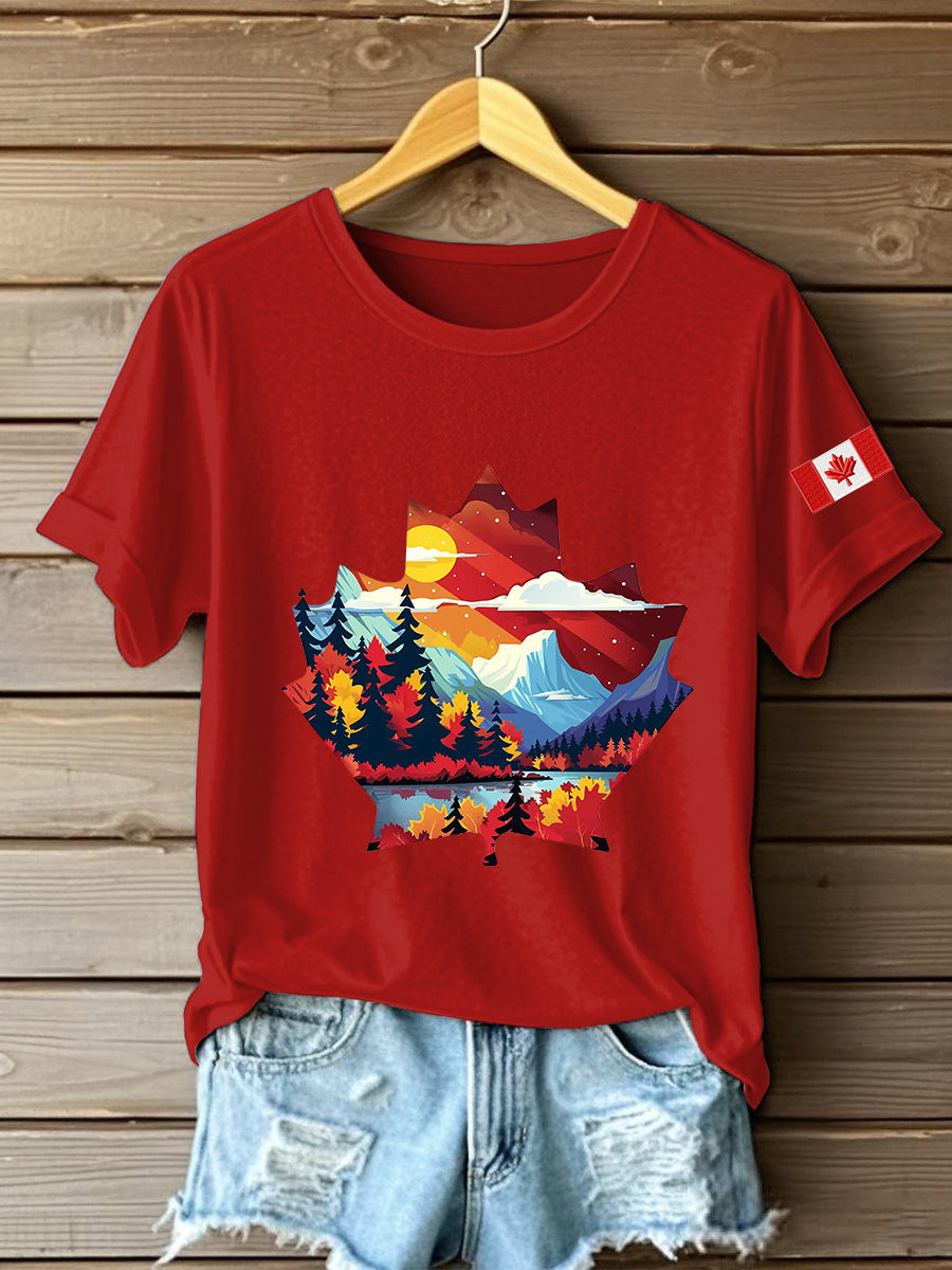 Women's Canadian Maple Leaf Landscape Print Casual Short Sleeve T-shirt