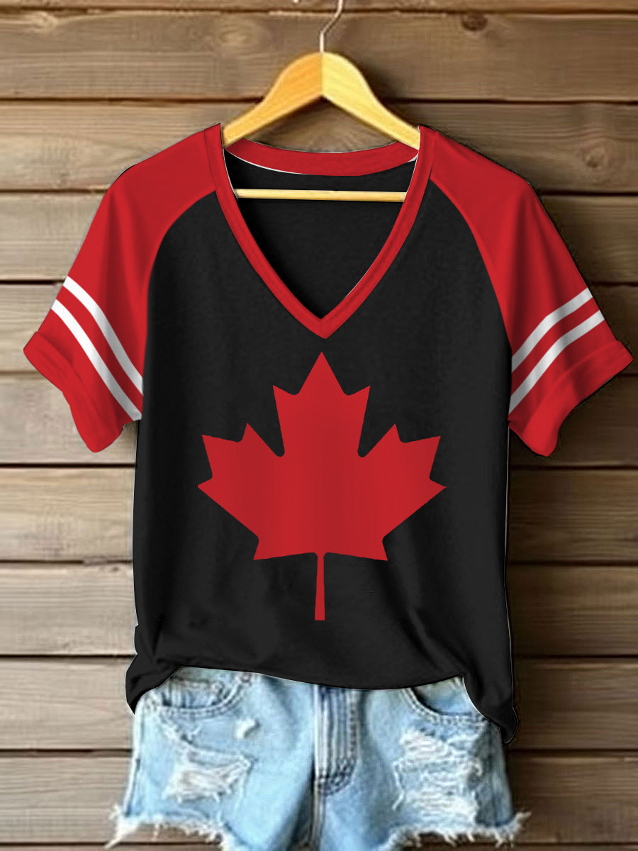 Women's Canadian Maple Leaf Print Casual V-Neck Tee