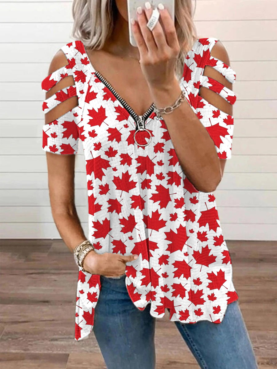 Women's Canadian Maple Leaf Print Casual Zipper V-Neck Off-Shoulder Top