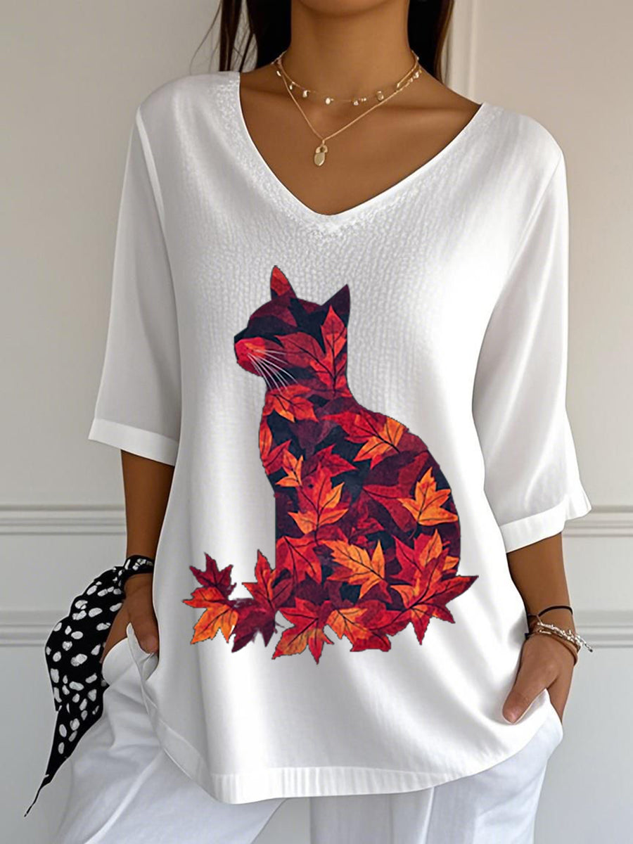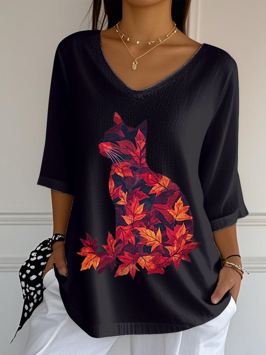 Women's Casual Autumn Leaves Cat Printed V-Neck Top