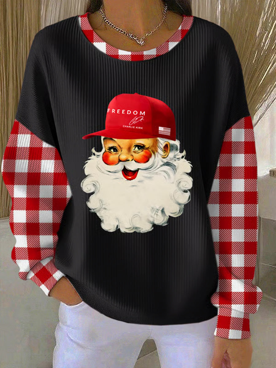 Women's Christmas Santa Claus Freedom Print Ribbed Round-Neck Sweatshirt