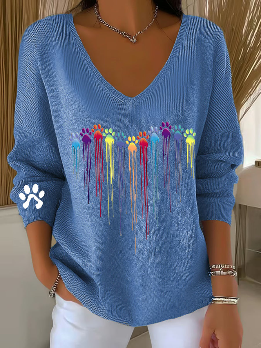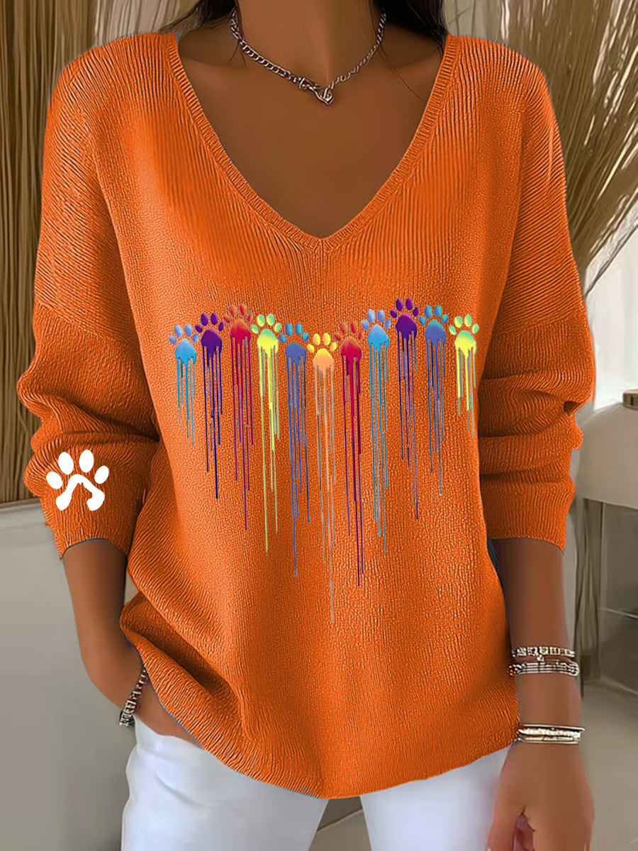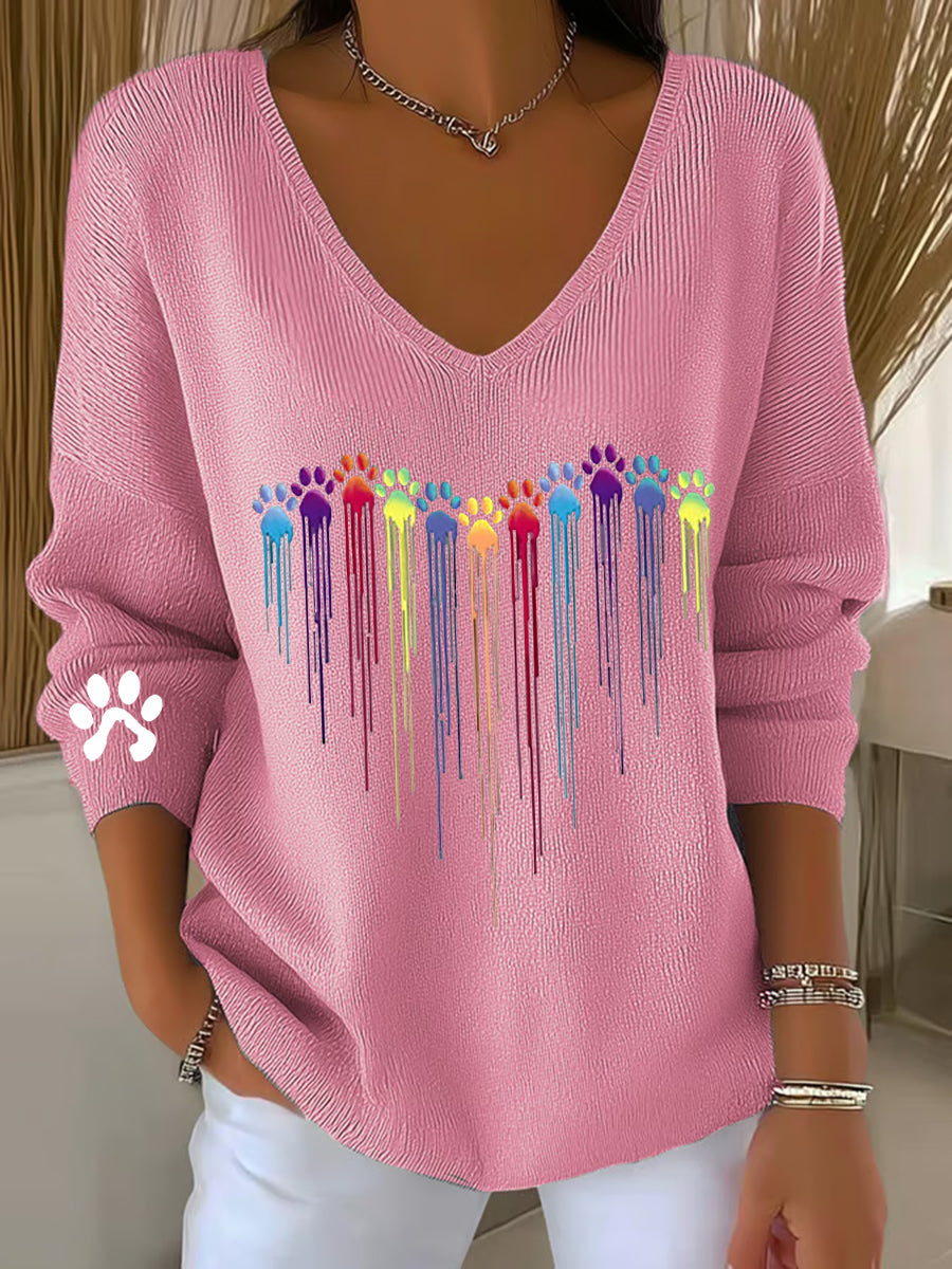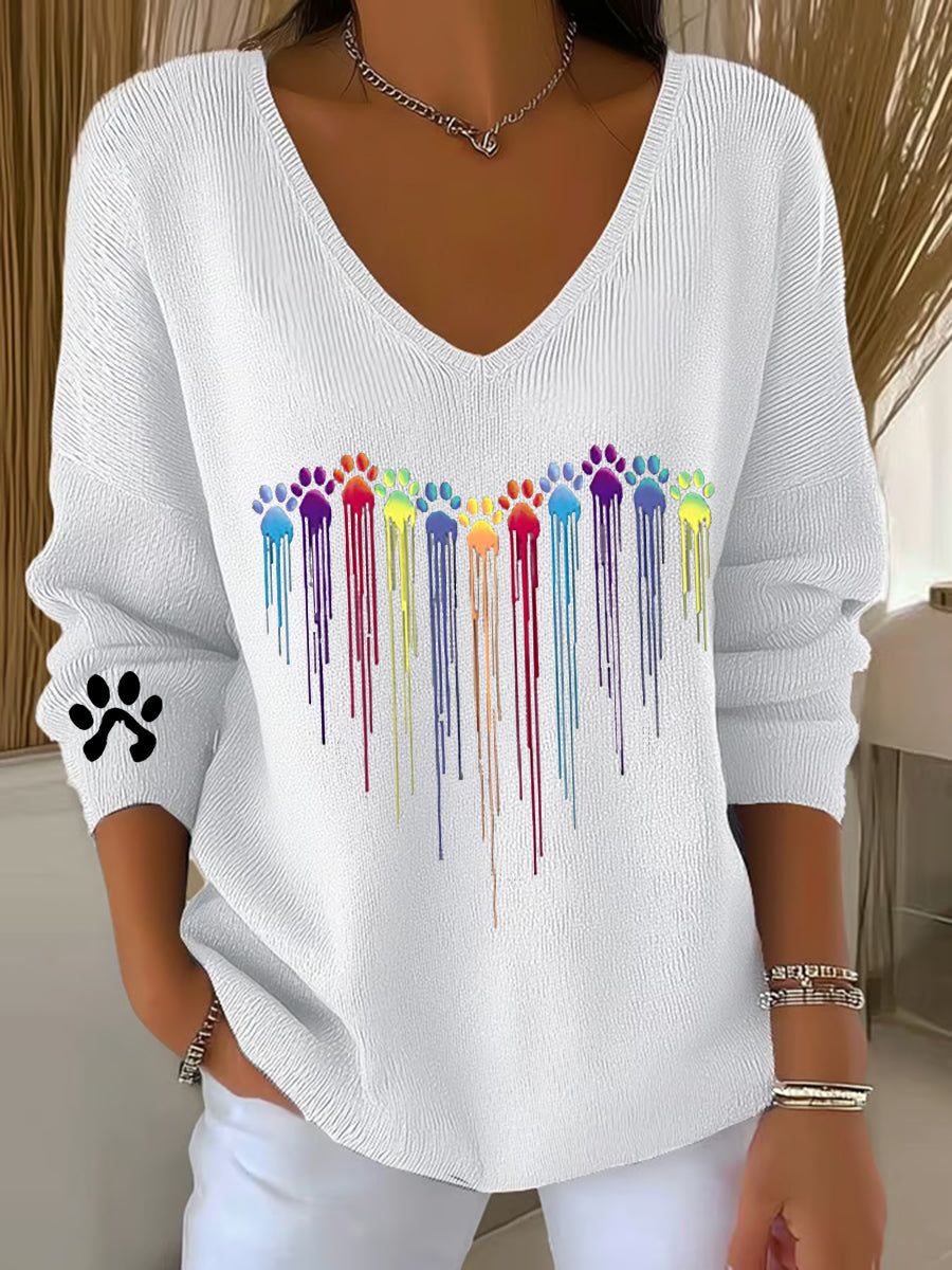 Women's  Colorful Dog Heart Paw Print Casual V-Neck Ribbed Top