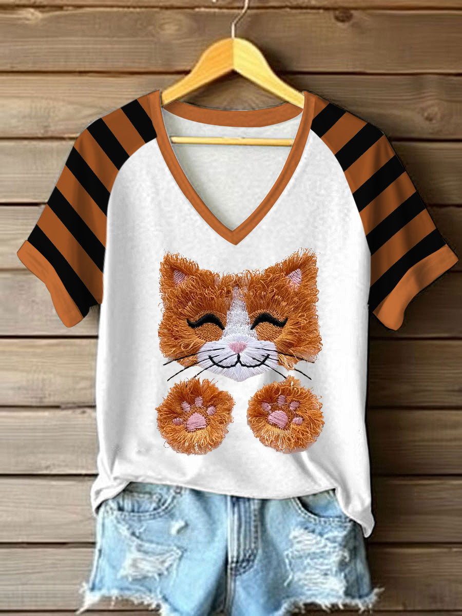 Women's Cute Cat V-neck off-shoulder short-sleeved T-shirt