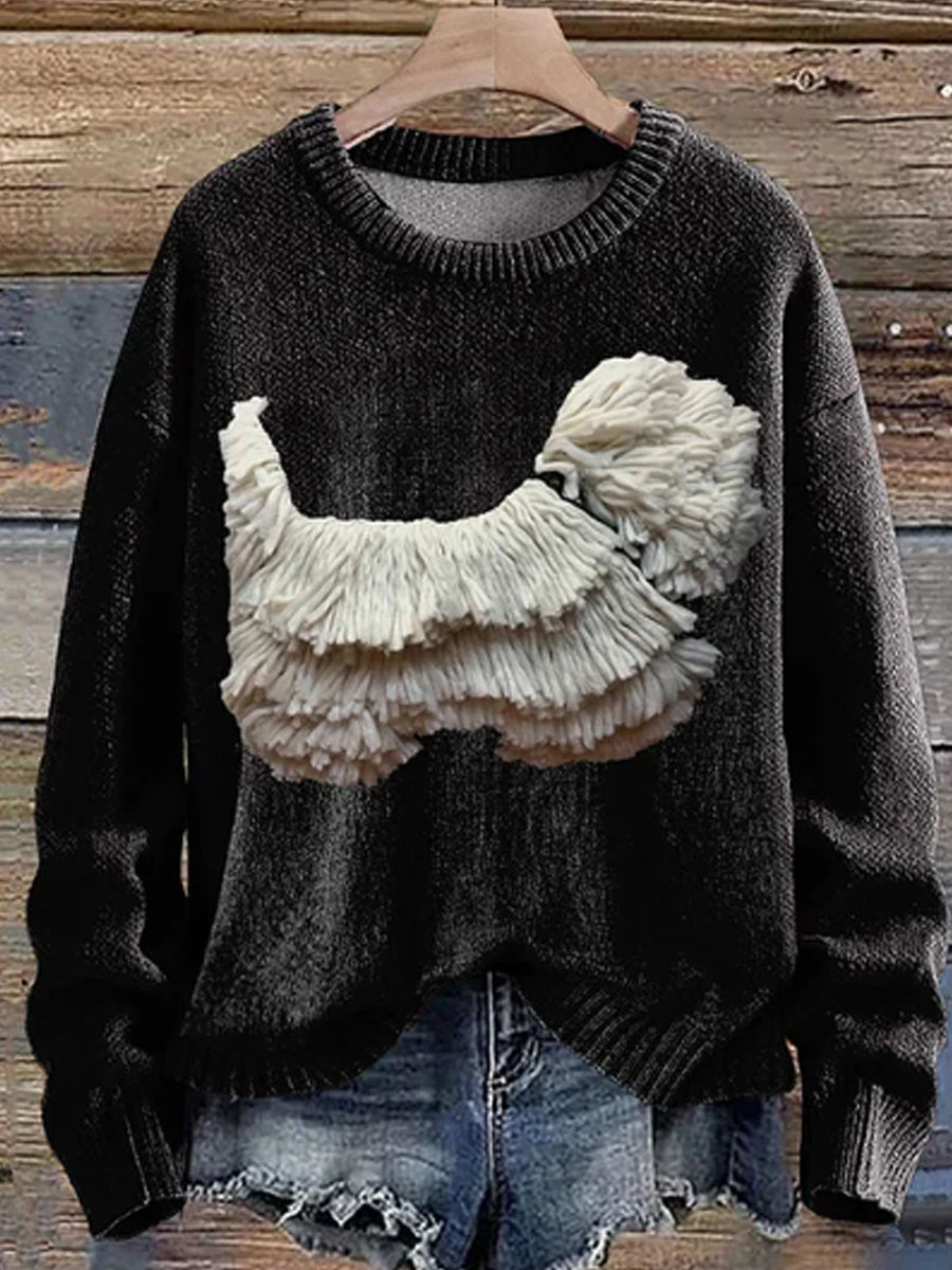 Women's Fringed Dog Print Knitted Long Sleeve Pullover Sweater