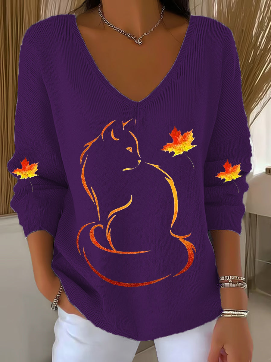 Women's It’s Fall Y’all Cute Cat Printed V-Neck  Casual Long Sleeve Shirt