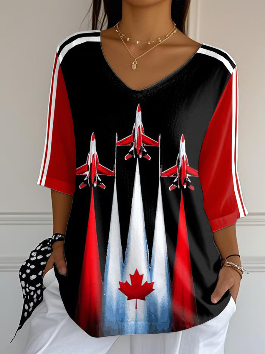 Women's Patriotic Canadian Air Plane Canada Flag and Maple Leaf Casual V-Neck T-Shirt