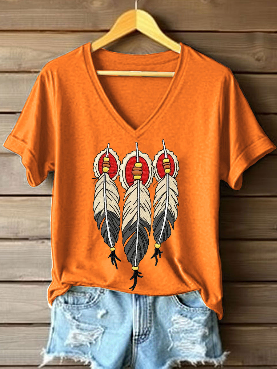 Women's Tribal Feather Embroidered V-Neck T-Shirt