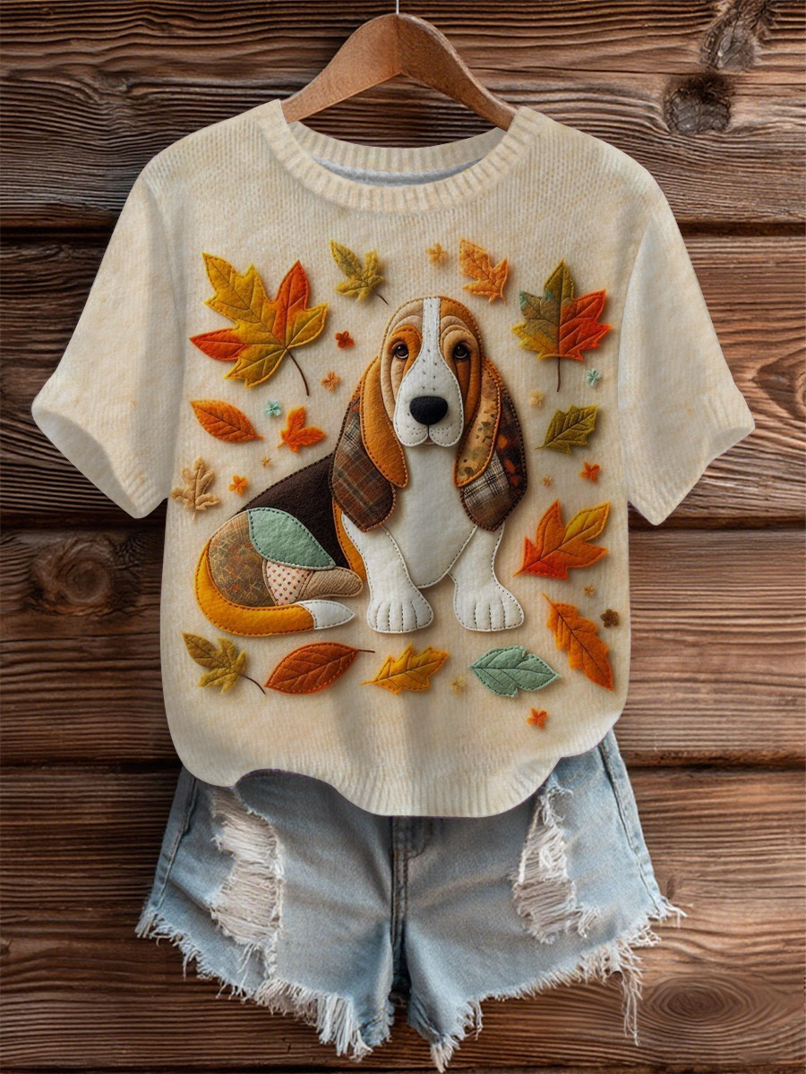 Women's Vintage Autumn Fallen Patchwork Dog Print Art Cozy Knit Top