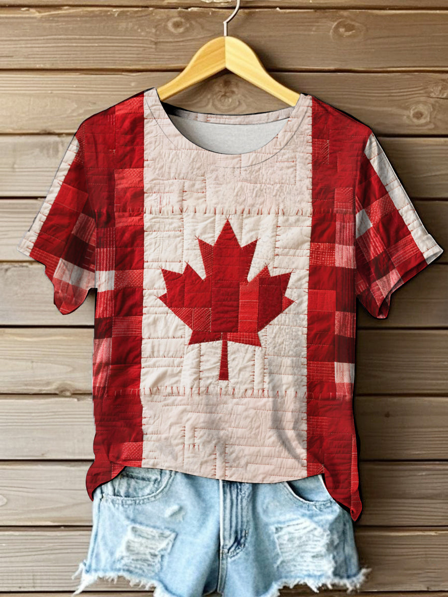 Women's Vintage Patchwork Canadian Maple Leaf Print Casual Tee